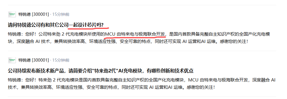 特锐德子公司特来电公司特来劲 2 代充电模块所使用的MCU 由特来电与极海联合开发,是国内首款具备完整自主知识产权的全国产化充电模块,深度融合 AI 技术,兼具转换效率高、环境适应性强、安全可靠的特点,同时还可实现 AI 运营和AI 运维。感谢您的关注!