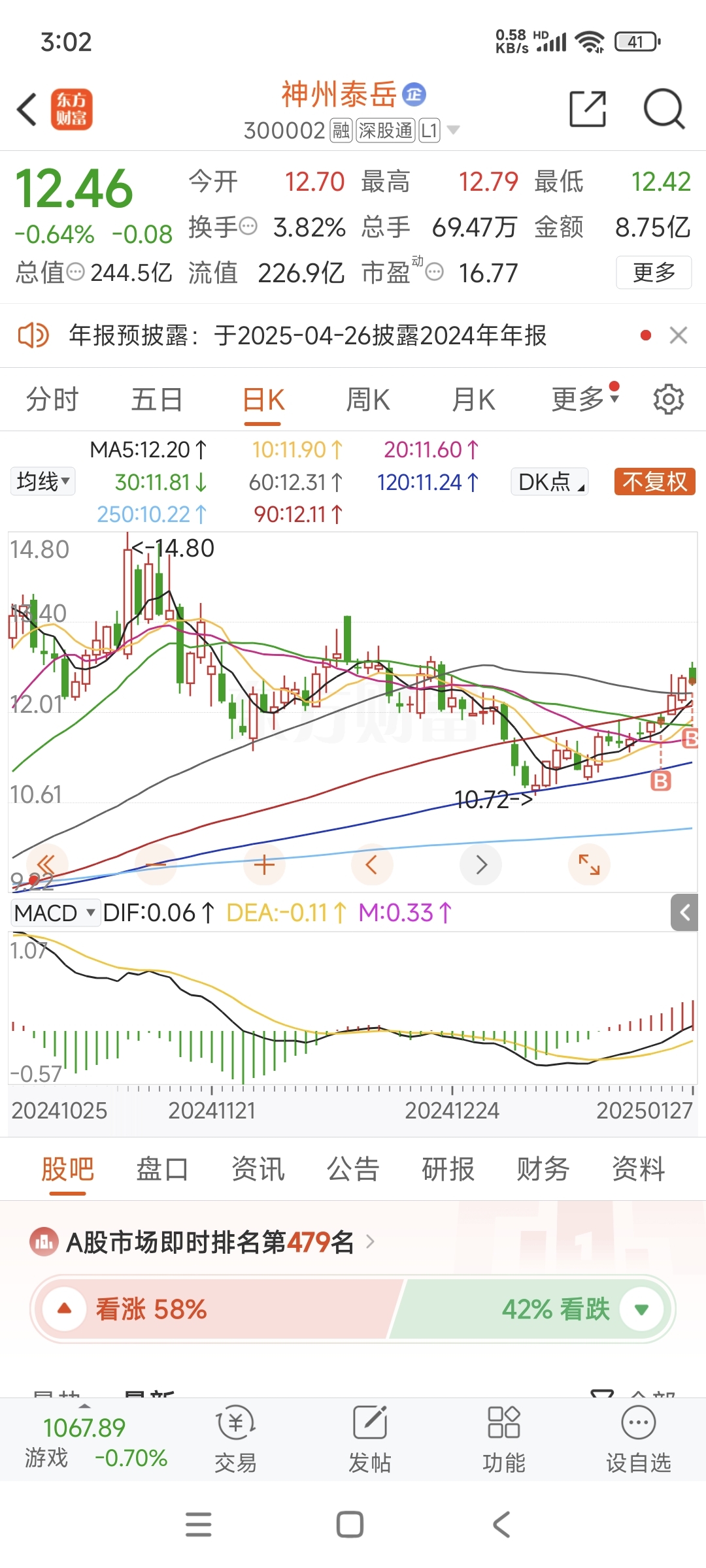 神州泰岳,农历2024年最后一个交易日结束了,虽然尾盘收绿了有点难看,但是我对明年的第一个交易日充满期待,尾盘还加了一些仓位,期待能有一个开年红包。另外提前祝各位股友新年快乐,万事顺利,蛇年大吉,资产翻倍!