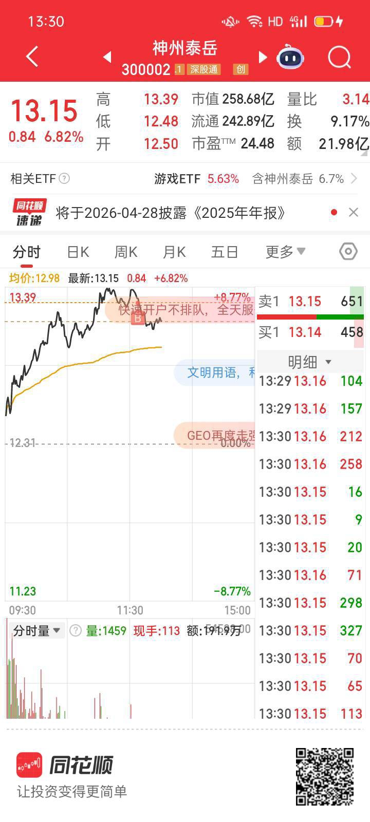 $神州泰岳(SZ300002)$ 看了一上午,出手进了8000股,马上啪啪打脸。晕死了,这个是我的幸运股啊!