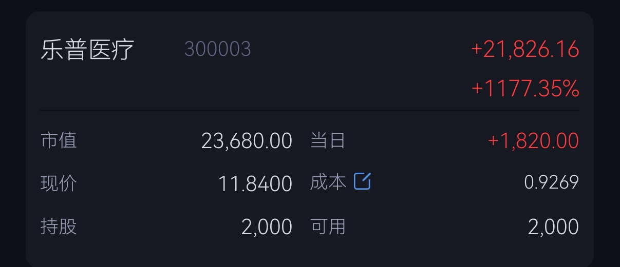 $乐普医疗(SZ300003)$ 就这个样子,分红就买点,拿到传给下一代。说到做到。