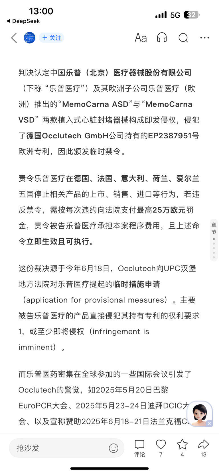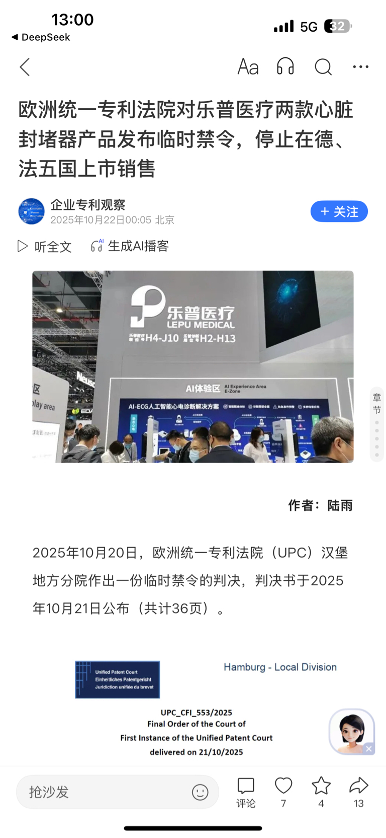 $乐普医疗(SZ300003)$ 乐普两款封堵器虽然被UPC临时禁令,但欧洲销量有限,不能阻碍乐普的长期向好发展趋势。