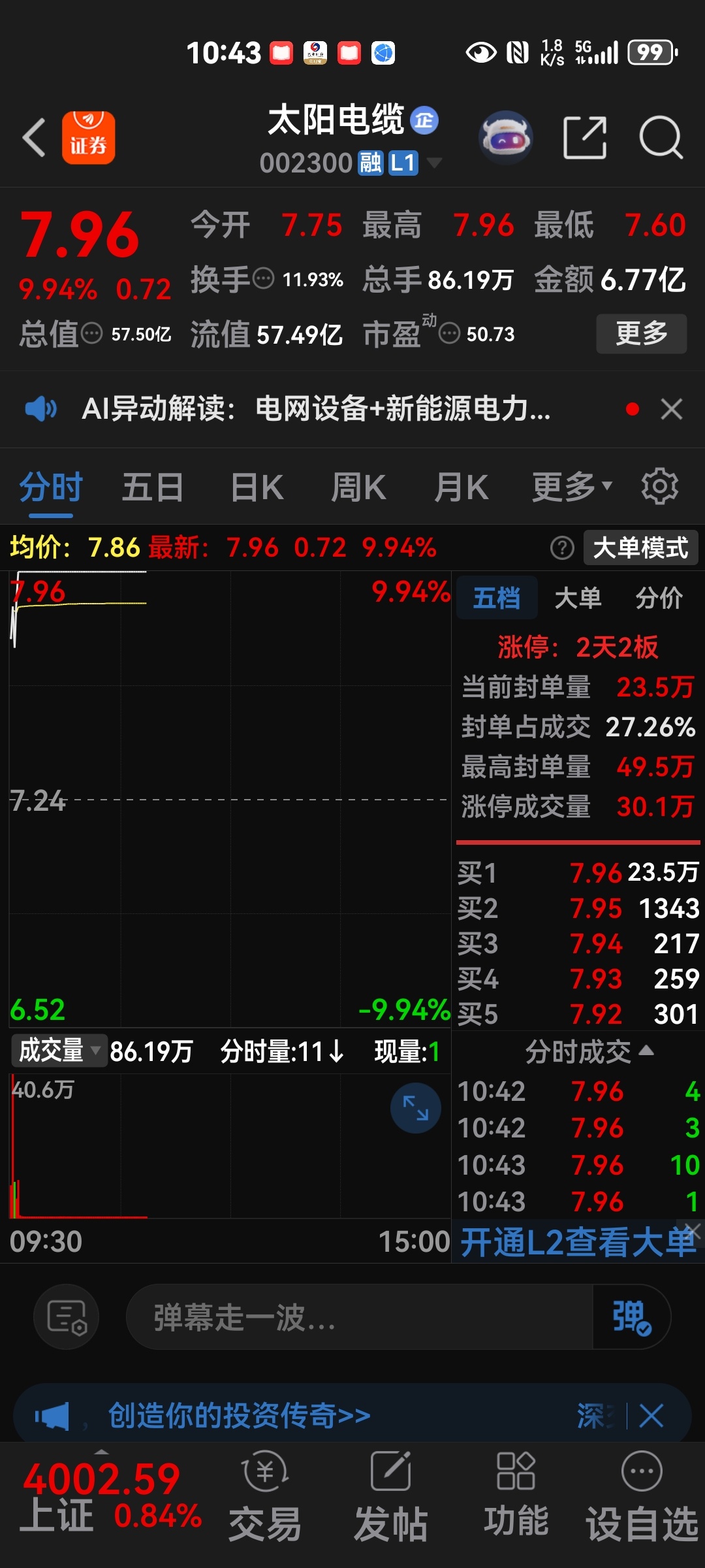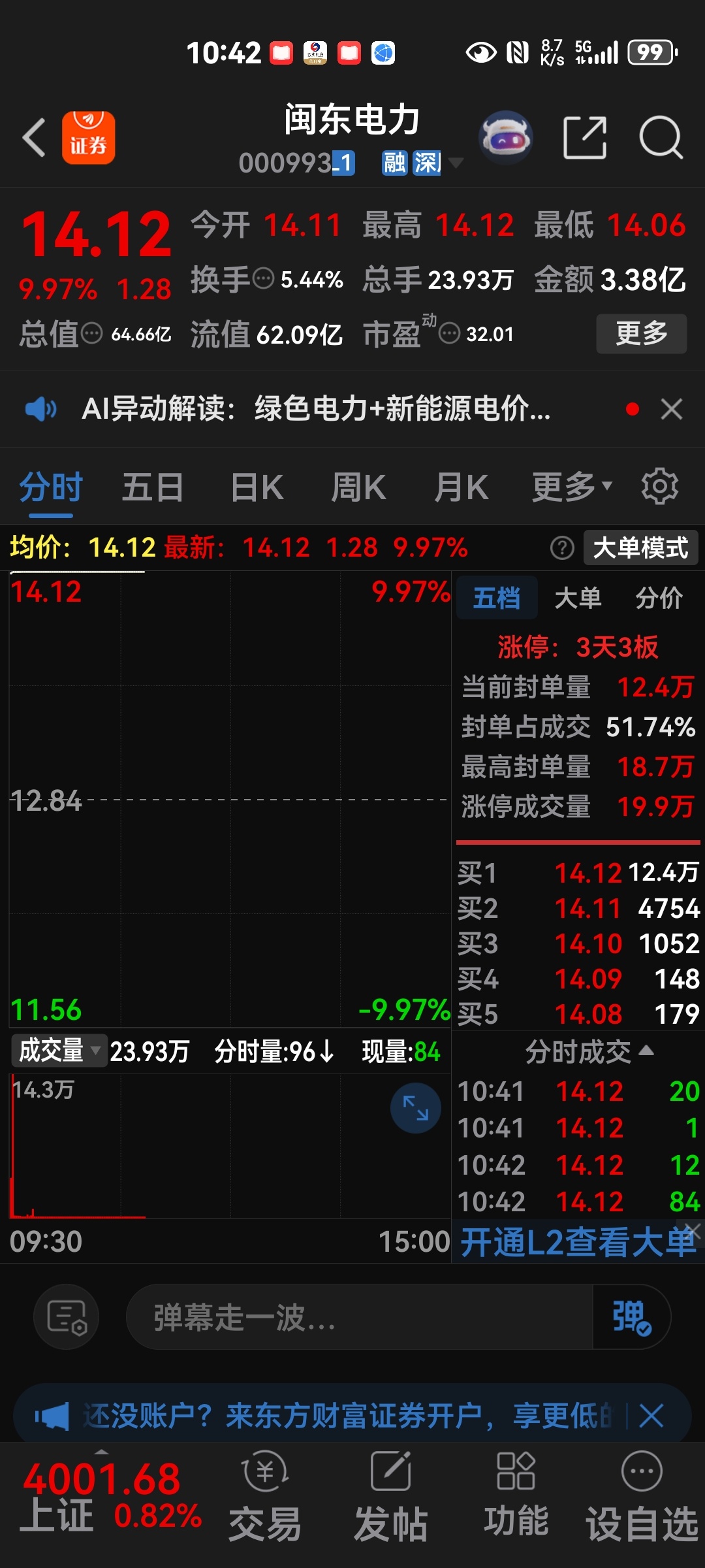 我第三次买南风股份很失望,昨天是它逼我清仓的。昨天抢买闽东电力,今天抢买太阳电缆