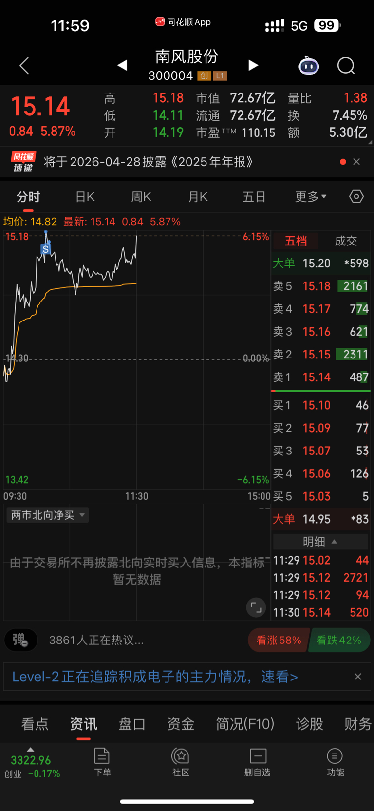 $南风股份(SZ300004)$ 早上最高点走了 看今天量 和价都突破 下午有望能拉 留下的兄弟发财