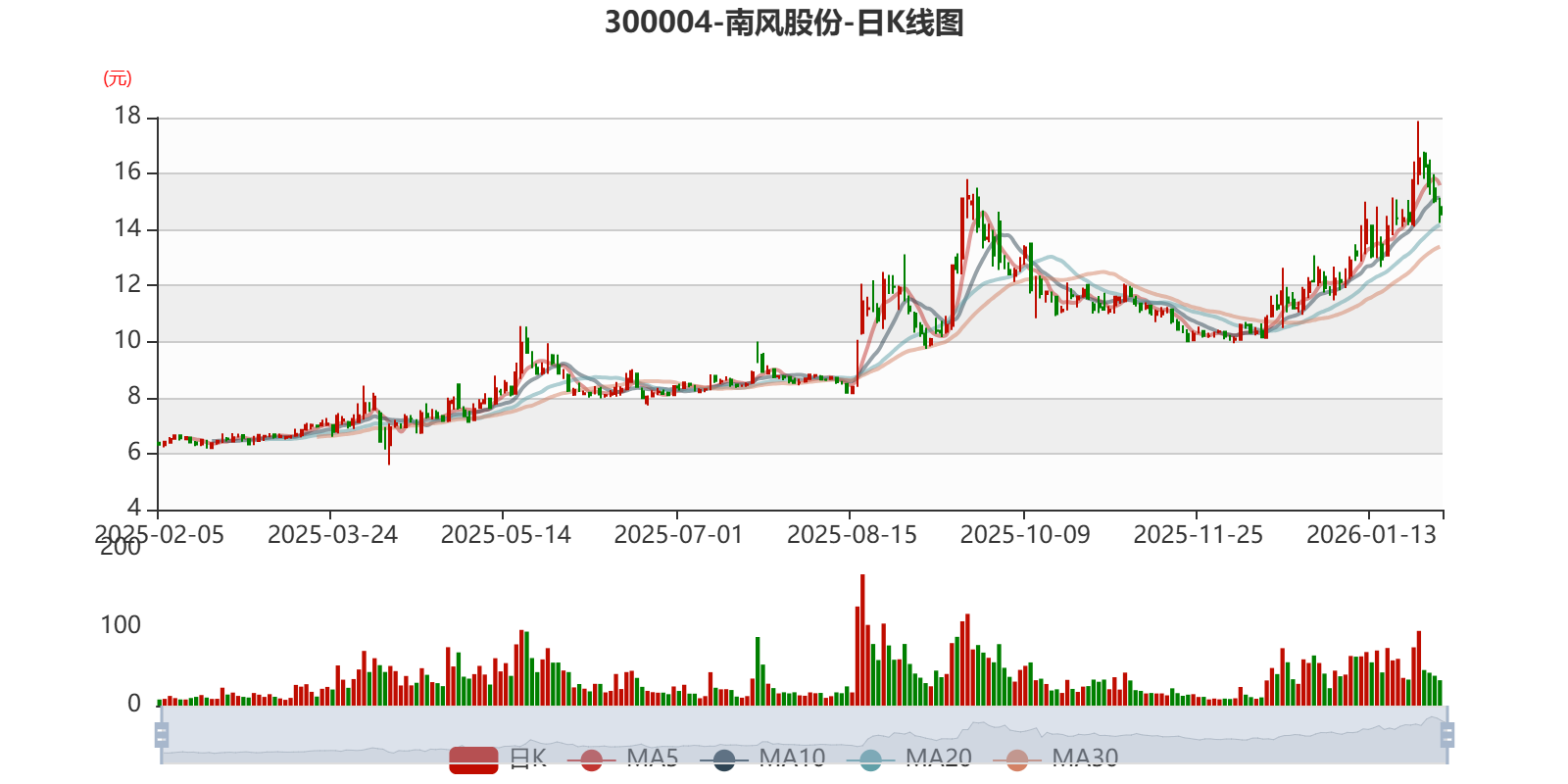中证智能财讯南风股份(300004)1月30日晚间披露2025年度业绩预告,预计2025年归母净利润3000万元至4500万元,同比下降39.59%-59.72%;扣非净利润预计2850万元-4275万元,同比下降39.25%-59.5%。以1月30日收盘价计算,南风股份目前市盈率(TTM)约为155.09倍-232.64倍,市净率(LF)约3.92倍,市销率(TTM)约11.77倍。
