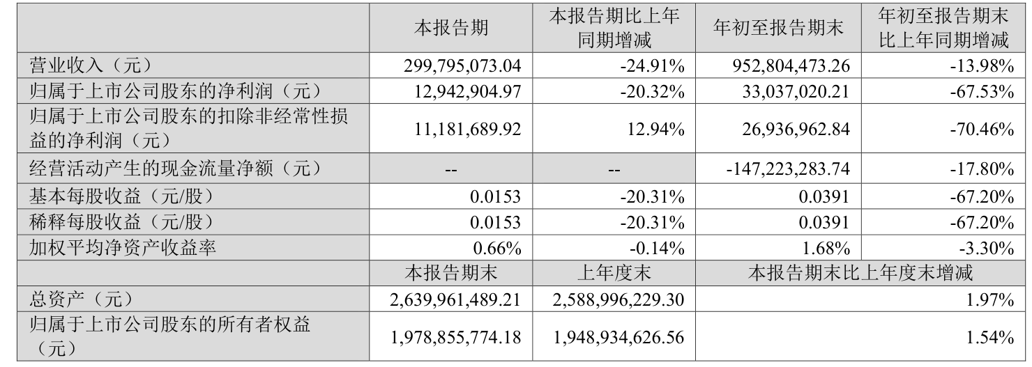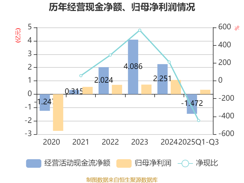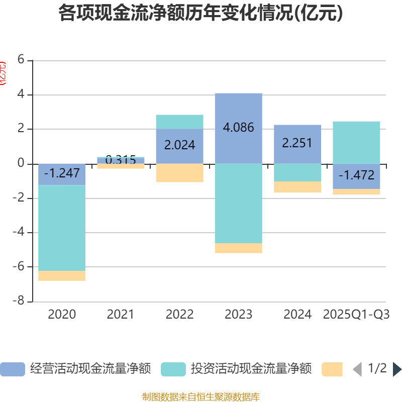 2025年前三季度,公司经营活动现金流净额为-1.47亿元,同比减少2224.25万元;筹资活动现金流净额-3181.16万元,同比增加312.27万元;投资活动现金流净额2.45亿元,上年同期为1.59亿元。