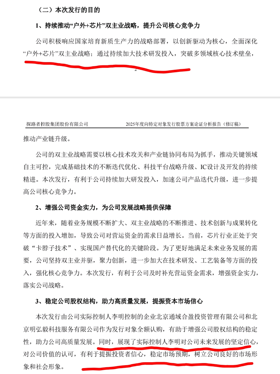 $探路者(SZ300005)$ 这次定向增发具有积极意义,增强上市公司资金实力,稳定股权,后续可能会有收购或自主研发的大动作。这次增发几乎全部由实控人认购出资,虽然有30%左右的溢价,但有限售期,显示了实控人对公司未来看好,舍得大投入,这就是最确定和最鼓舞人心的!
