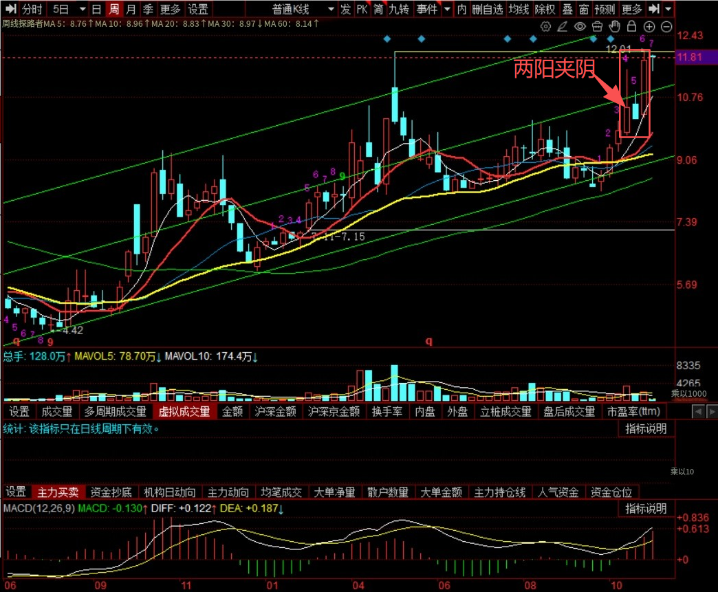 上周收周阳线,作两阳夹阴上攻K线技术形态,后市看多!