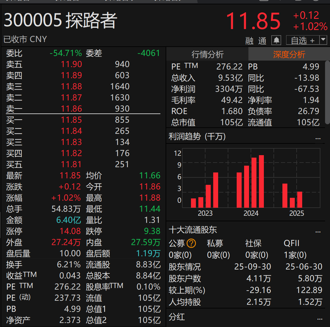 截至12月1日收盘,探路者报11.85元/股,总市值为105亿元。