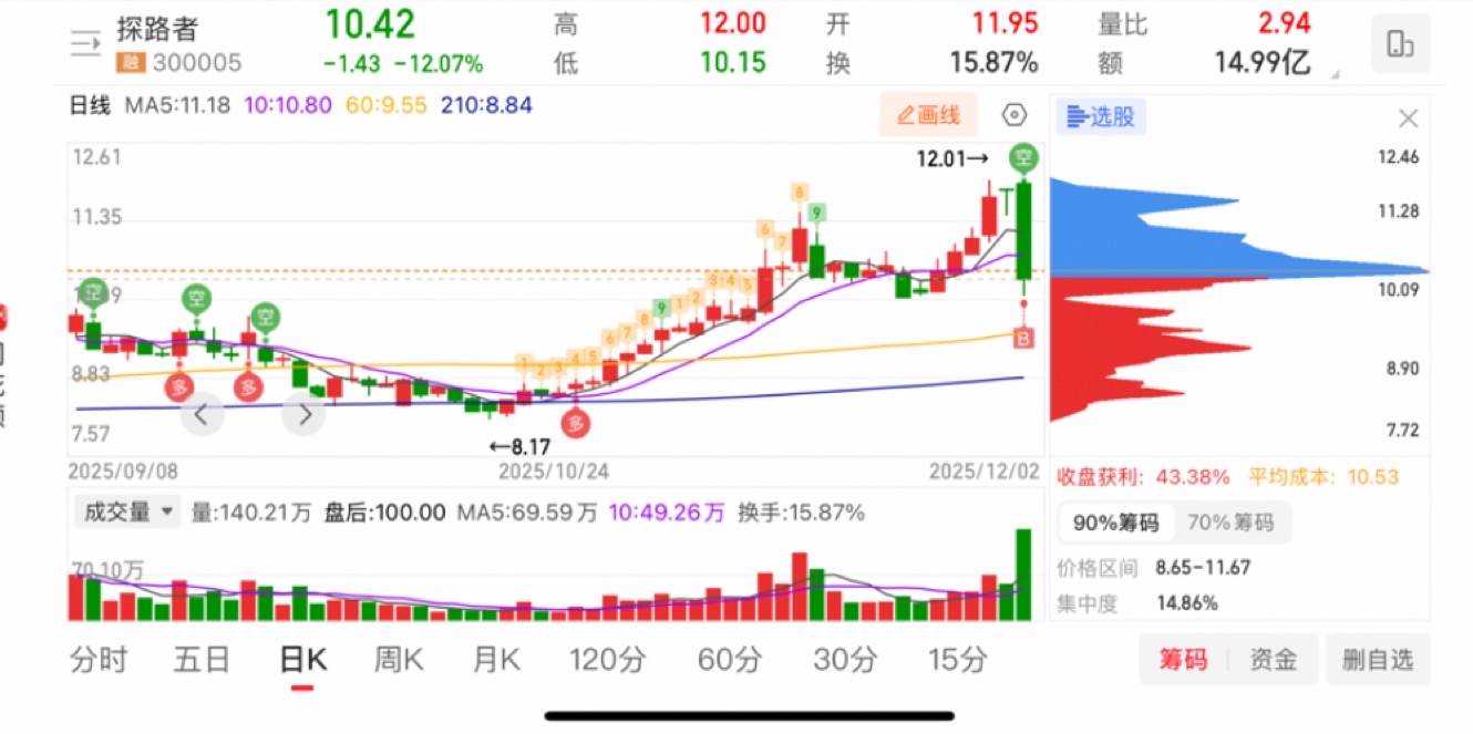 $探路者(SZ300005)$ 连续小阳缓涨以后,筹码基本都获利,很浮躁。一根恐慌大阴线杀下来,快速收集所有筹码。成交量是倍量、巨量,量的本质是发生了大量交易,有人卖有人买,谁在卖、谁在买呢?卖出的情绪和买入的情绪心理是什么样的。具体看明天,水上阳大概率。