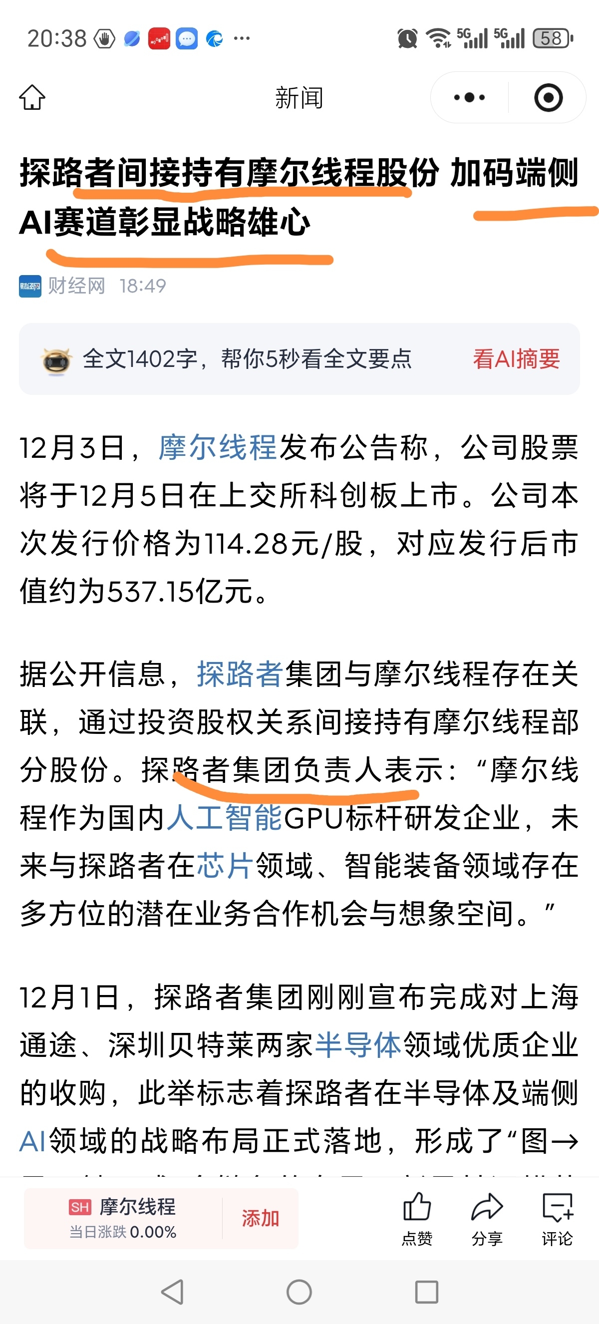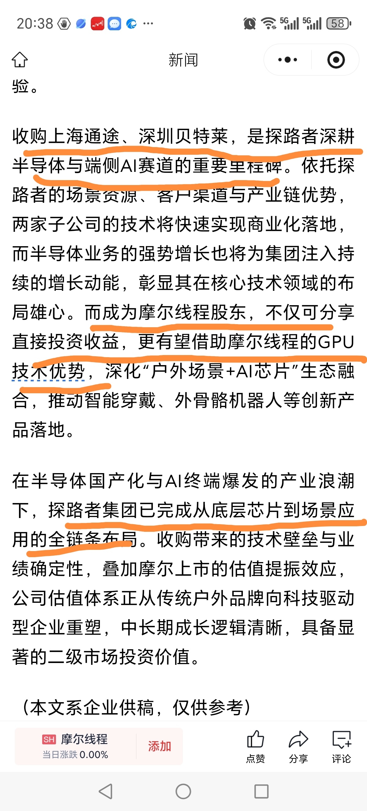 $探路者(SZ300005)$ 通过投资股权关系间接持有摩尔线程部分股份。探路者集团负责人表示:"摩尔线程作为国内人工智能GPU标杆研发企业,未来与探路者在芯片领域、智能装备领域存在多方位的潜在业务合作机会与想象空间。