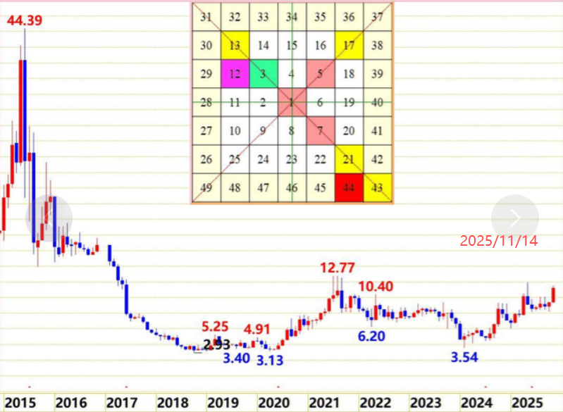 昨天都讲了要冲破 13元的,截止目前最高见 13.13元,或在13元带震荡洗盘站稳后向稍远点目标 17和21前进。见 25/11/14画的江恩矩阵图。