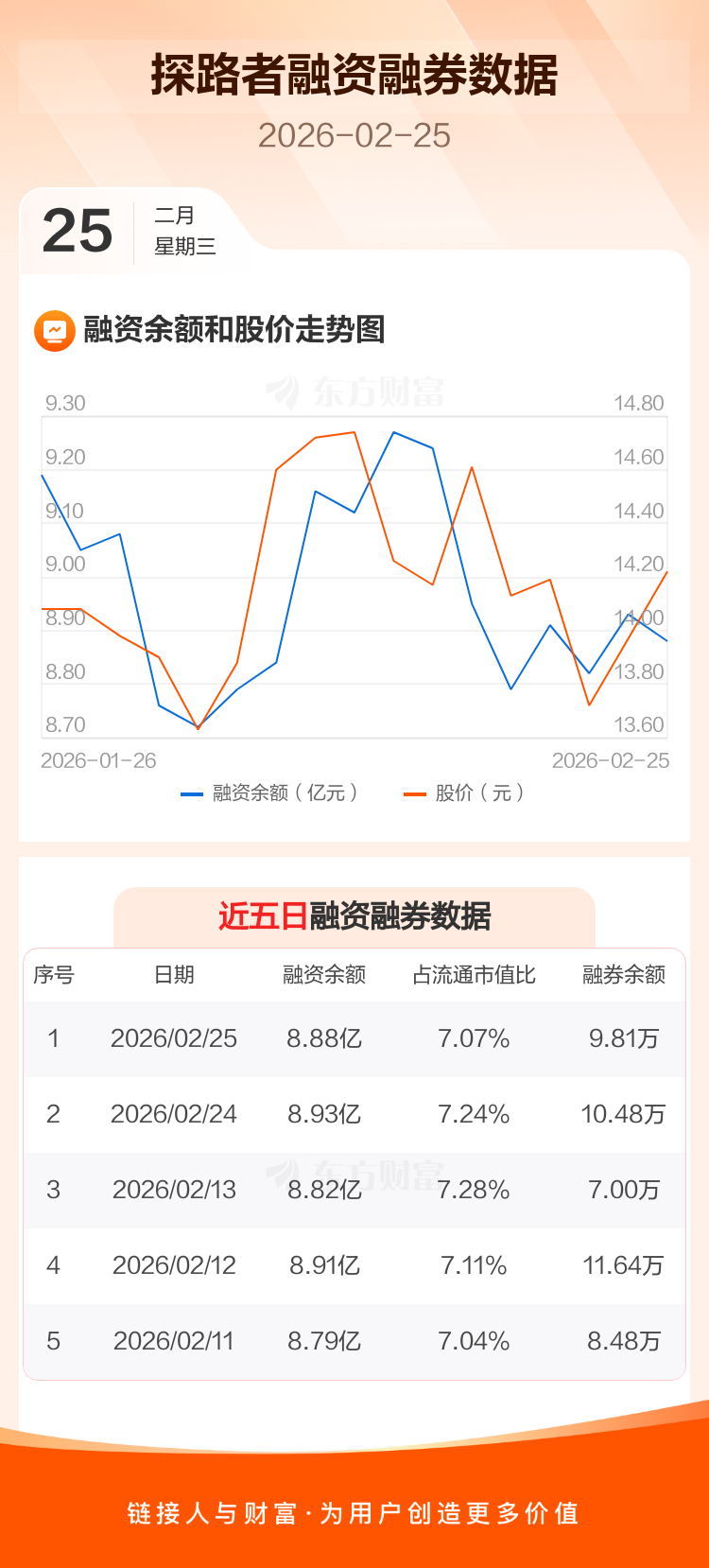 交易所最新数据显示,探路者于2026年2月25日获融资买入3955.84万元,融资偿还4463.67万元,当日融资净偿还507.83万元。目前,该股融资余额8.88亿,占流通市值比例为7.07%。