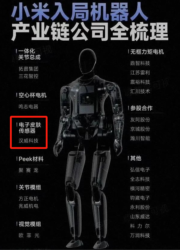 汉威科技子公司苏州能斯达是柔性感知产业的领航者,为人形机器人领域的应用提供完整的智能感知解决方案,公司在柔性传感、家电传感领域与小米集团有合作