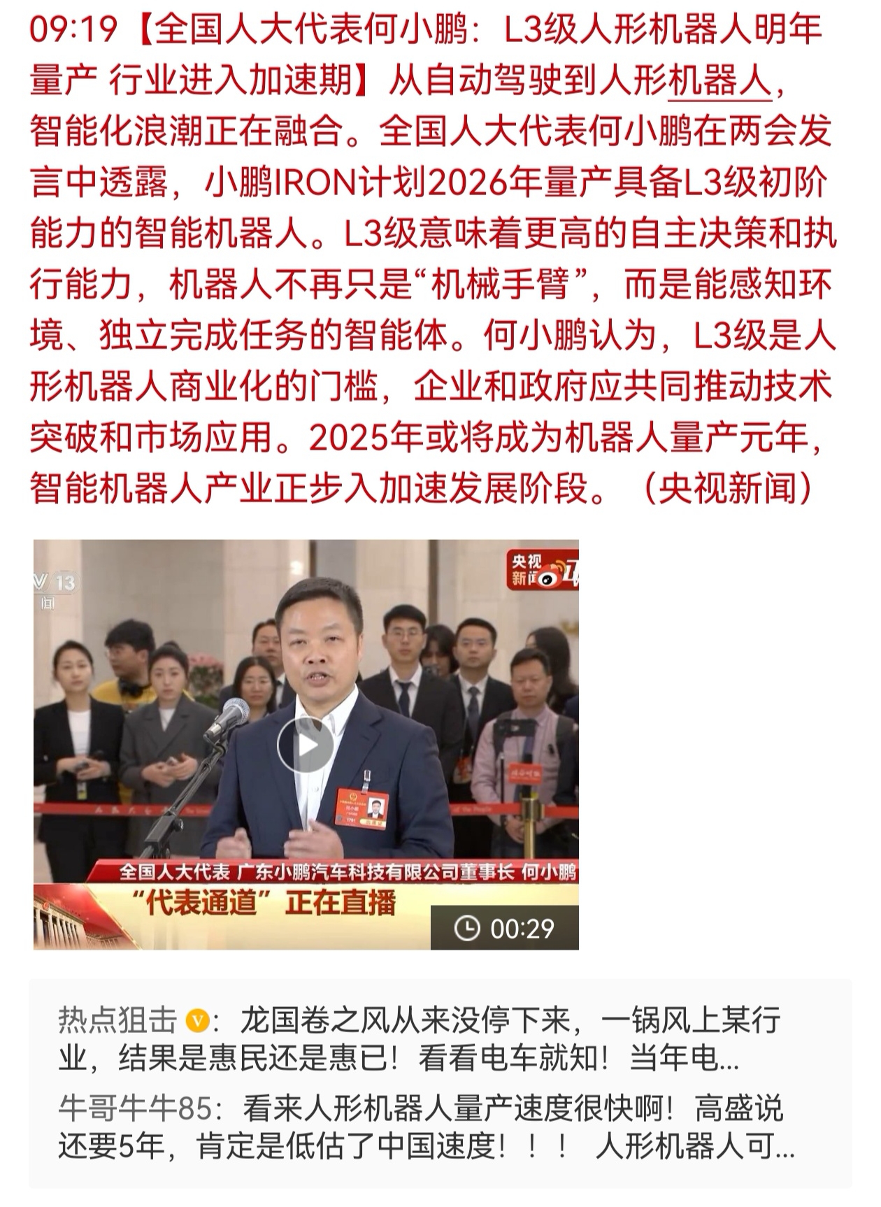 【全国人大代表何小鹏:L3级人形机器人明年量产 行业进入加速期】