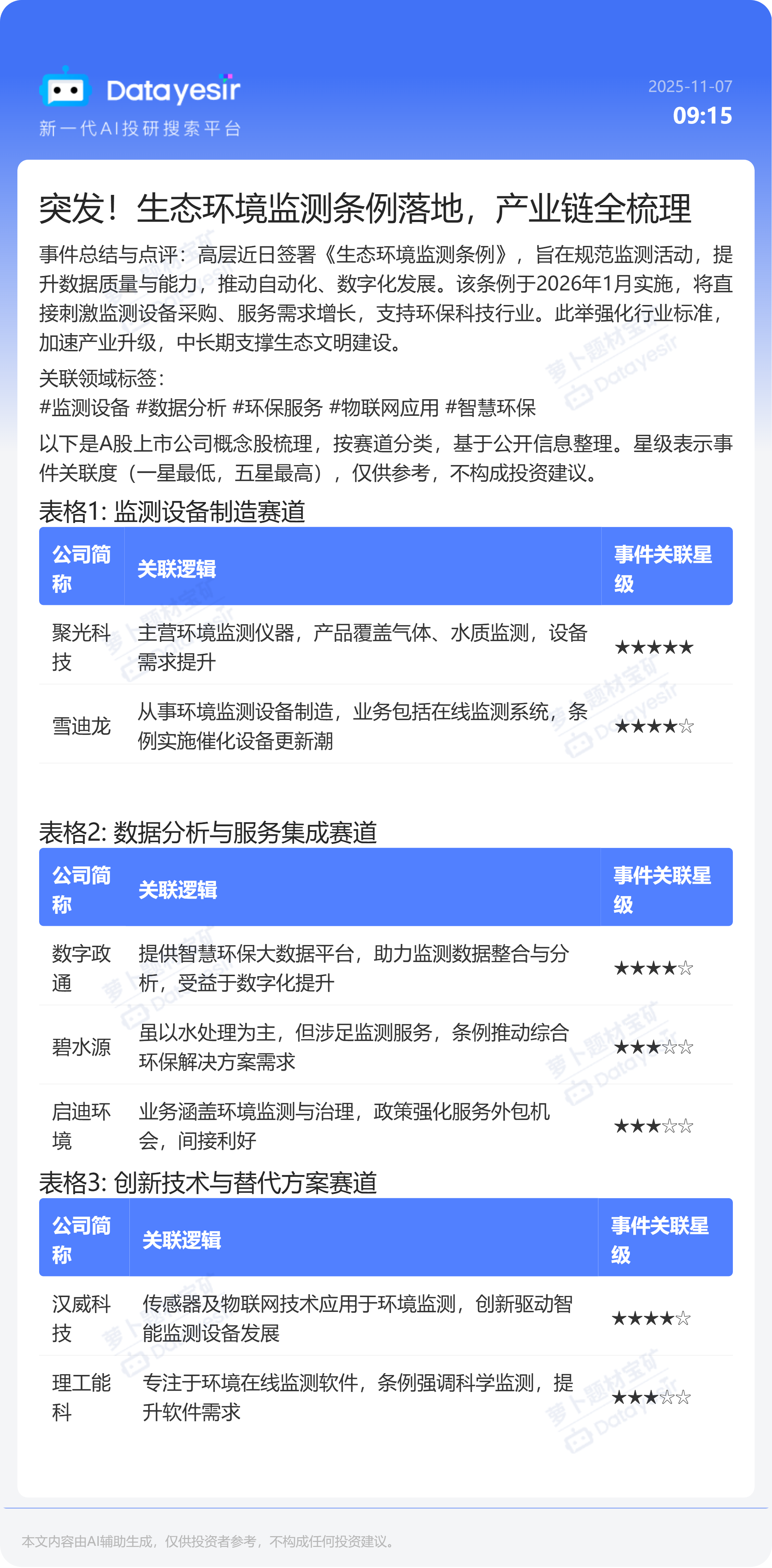 高层近日签署《生态环境监测条例》,旨在规范监测活动,提升数据质量与能力,推动自动化、数字化发展。该条例于2026年1月实施,将直接刺激监测设备采购、服务需求增长。