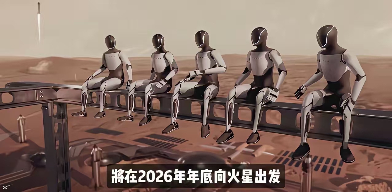 马斯克计划2026年底用星舰送擎天柱前往火星,2027年抵达,为人类登陆铺路,承担基建与环境探测任务。