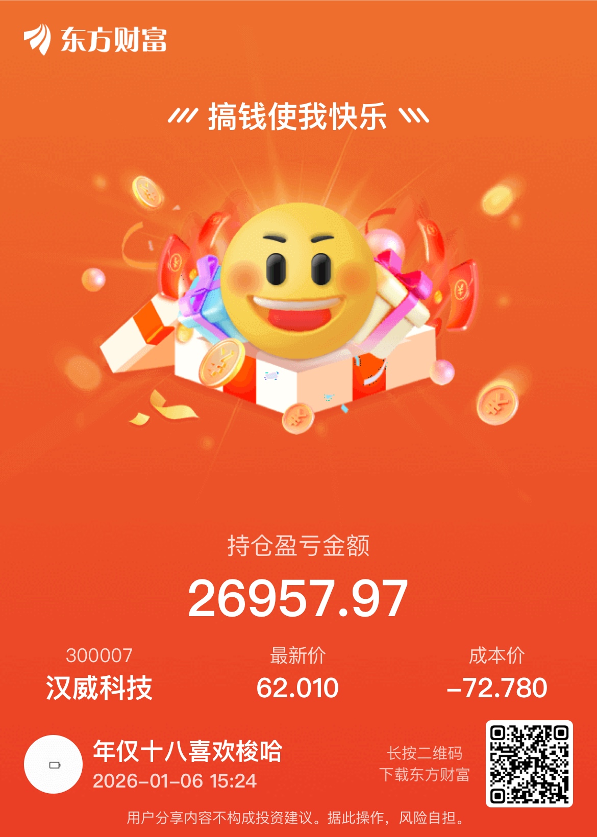 温馨提示: 1.根据《证券法》规定,禁止编造、传播虚假信息或者误导性信息,扰乱证券市场;2.用户在本社区发表的所有资料、言论等仅代表个人观点,与本网站立场无关,不对您构成任何投资建议。用户应基于自己的独立判断,自行决定证券投资并承担相应风险。《东方财富社区管理规定》