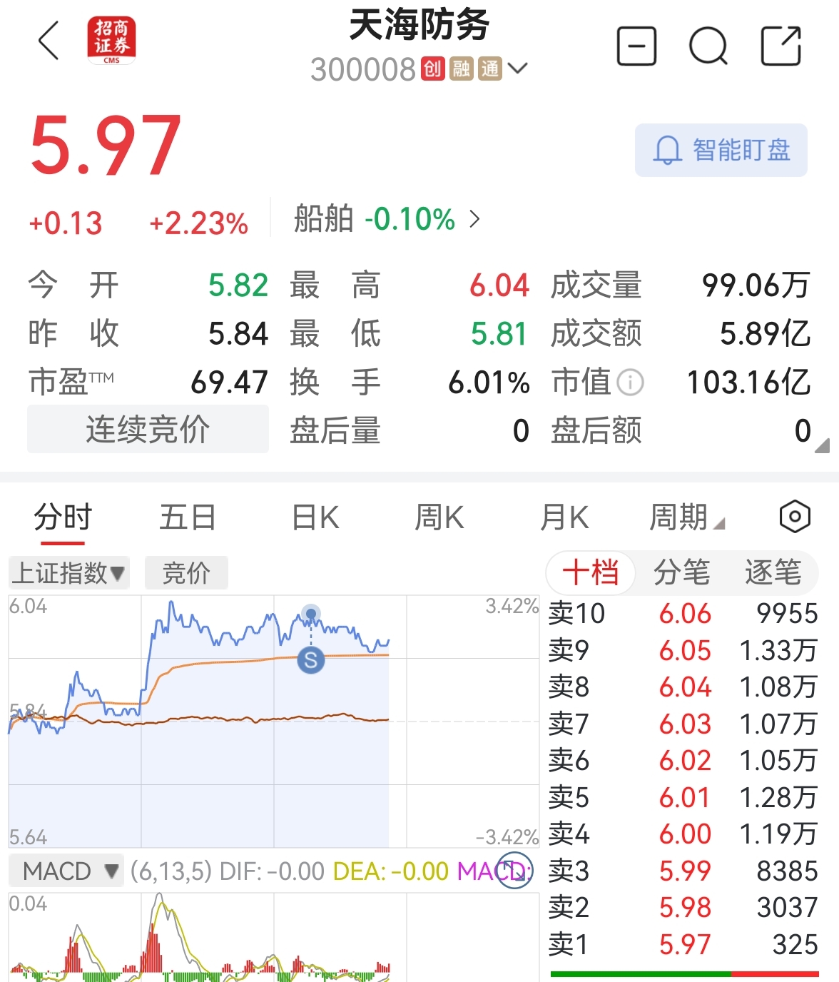 $天海防务(SZ300008)$ 这股真的是300打头吗?哈哈哈哈,6.01先出来一点点,下去再接,这两天能上6.8全给你
