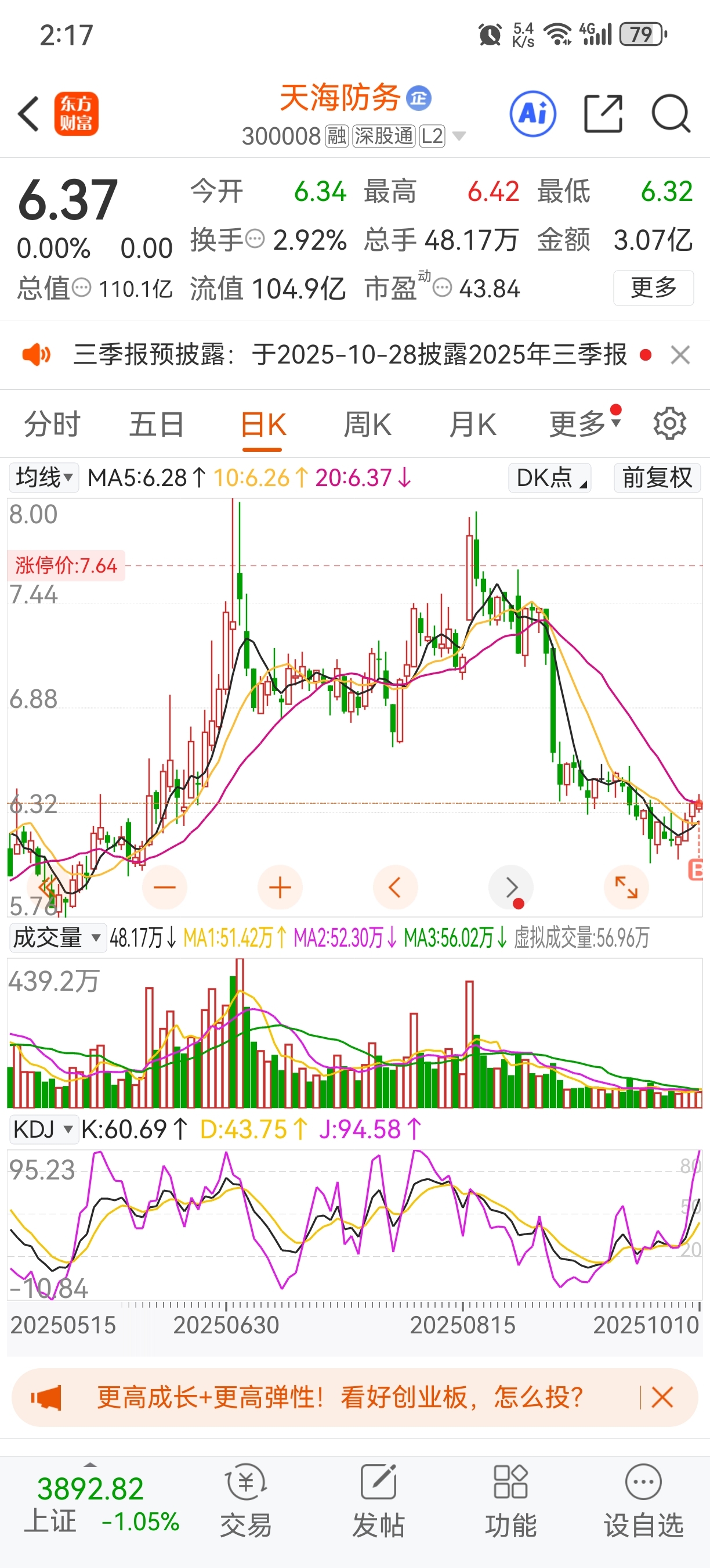 $天海防务(SZ300008)$ 里面的老铁,不用慌,我来给你们抬轿,6.37强势进场。