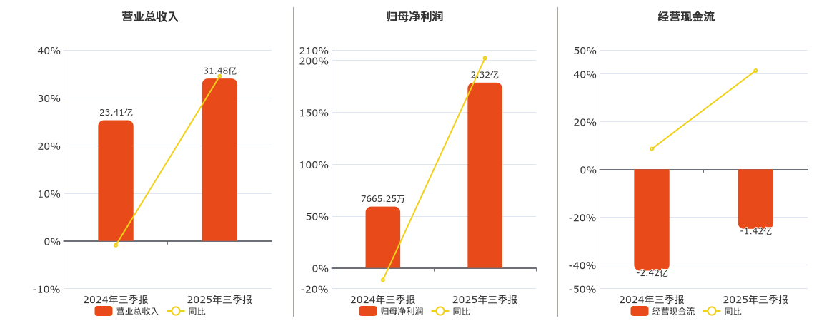 公司营业总收入为31.48亿元。归母净利润为2.32亿元。经营活动现金净流入为-1.42亿元,在已披露的同业公司中排名第4。
