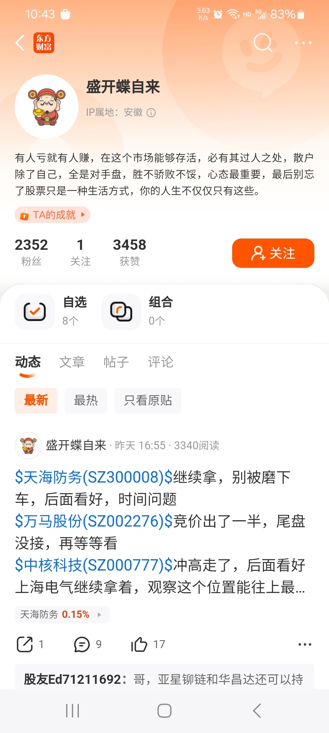 $天海防务(SZ300008)$ 这家伙之前把人骗去接盘,套牢后,消失一个多月没发帖,那些不好的言论全部删除加拉黑。现在又冒出来了,推荐天海,还指导性该怎么操作,低下一大堆小白似的留言,不知道是不是真人。这几天涨不起跌不下,估计在吸引散户,只是现在数量不达标,所以股价一直跌不下来。想想有些人也是可怜,把自己的手中可怜的钱交给一个素未谋面的神棍,然后一生一世被套牢在此,苦苦煎熬备受折磨在天海。