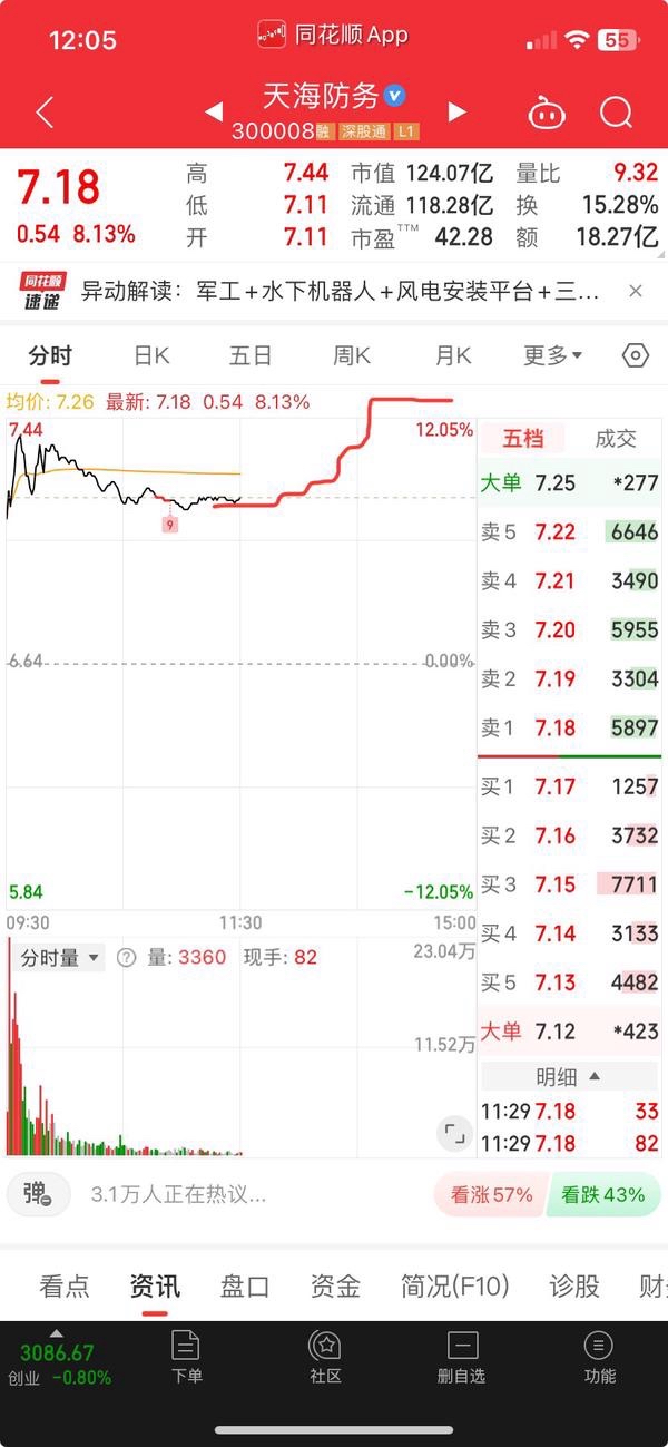 $天海防务(SZ300008)$ 下午走势,拿住了