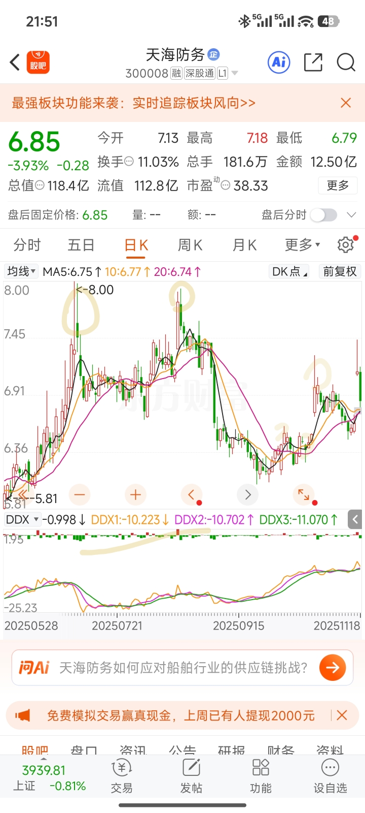 $天海防务(SZ300008)$ 宝总说:明天继续大跌9个点以上,因为这个货每次出现上影线的时候第2天必跌无疑
