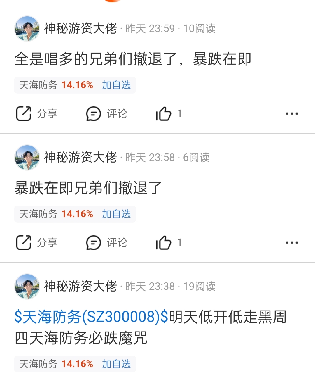 $天海防务(SZ300008)$ 感觉是颇有身份?不过大佬得有大佬的样子?明天我也想跑人,不过你这一晚上连发多贴看空着急的样子,是不是有失身份?