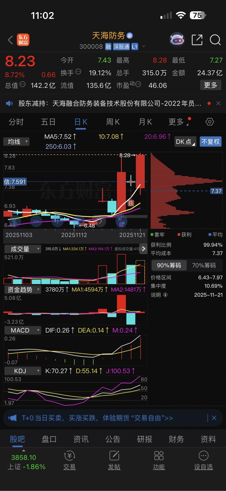 $天海防务(SZ300008)$ 昨天尾盘买的,今天逆市上攻