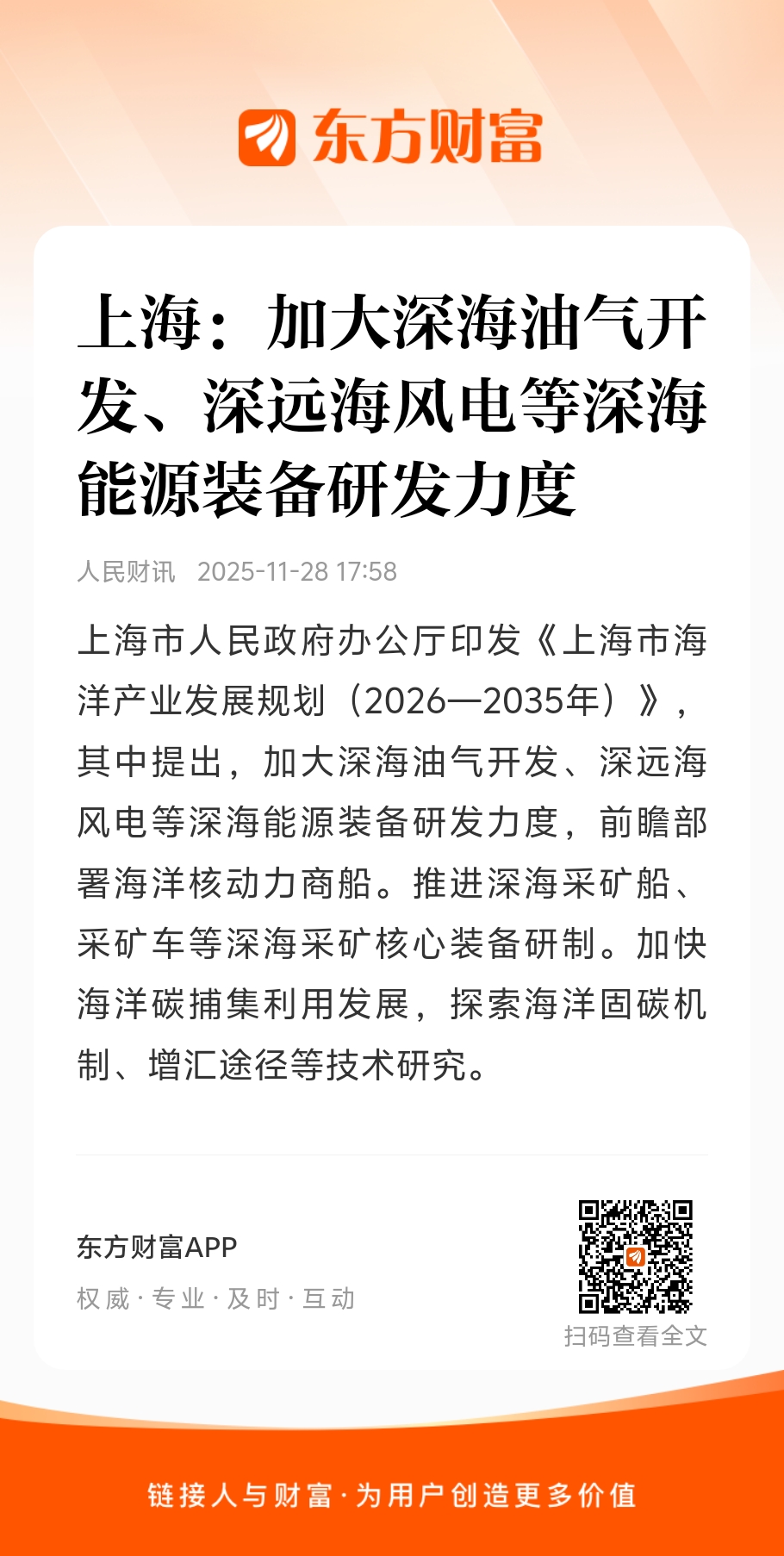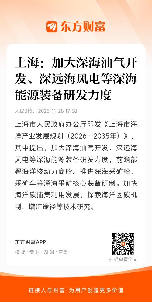 上海市人民政府办公厅印发《上海市海洋产业发展规划(2026—2035年)》,其中提出,加大深海油气开发、深远海风电等深海能源装备研发力度,前瞻部署海洋核动力商船。推进深海采矿船、采矿车等深海采矿核心装备研制。加快海洋碳捕集利用发展,探索海洋固碳机制、增汇途径等技术研究。