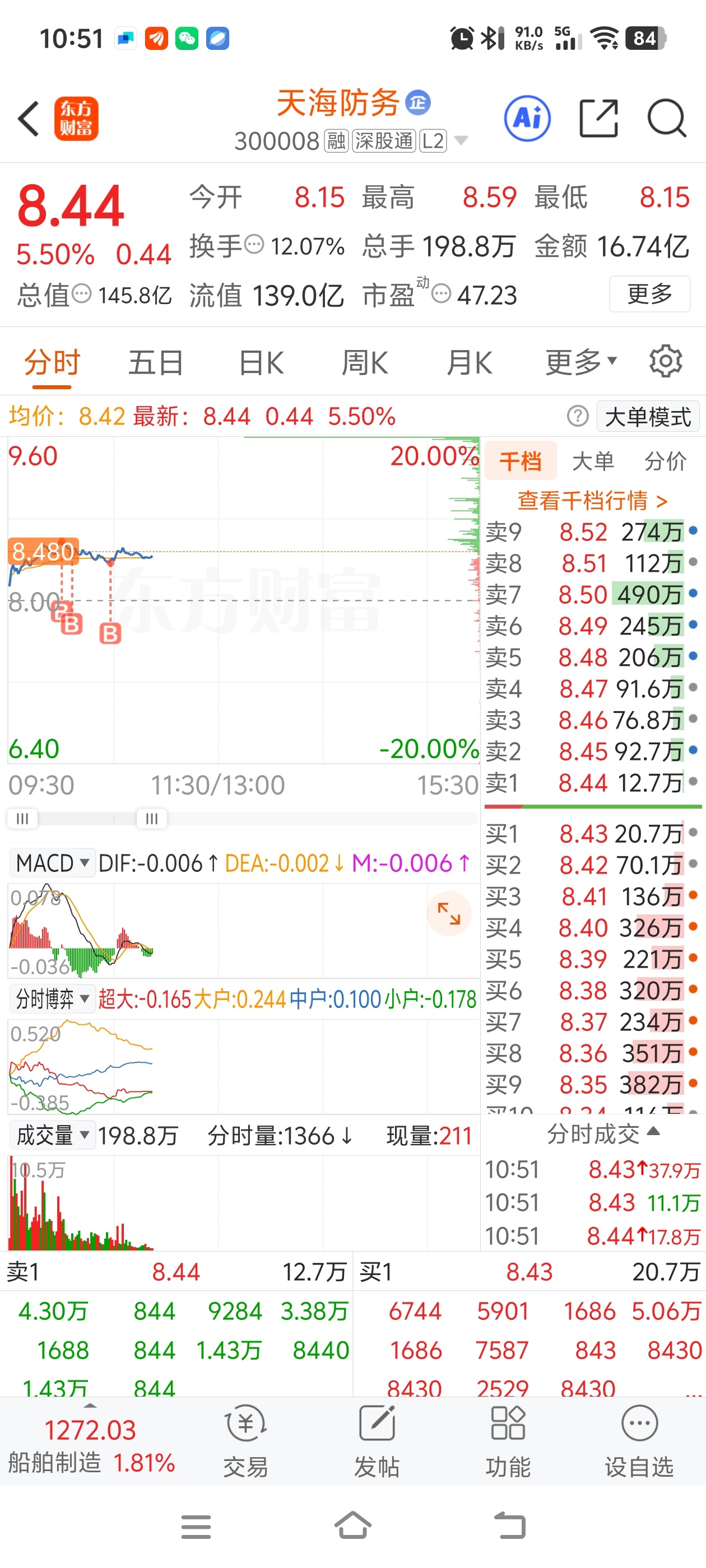 $天海防务(SZ300008)$ 6个点追进来2000能不能今天给点肉尝尝
