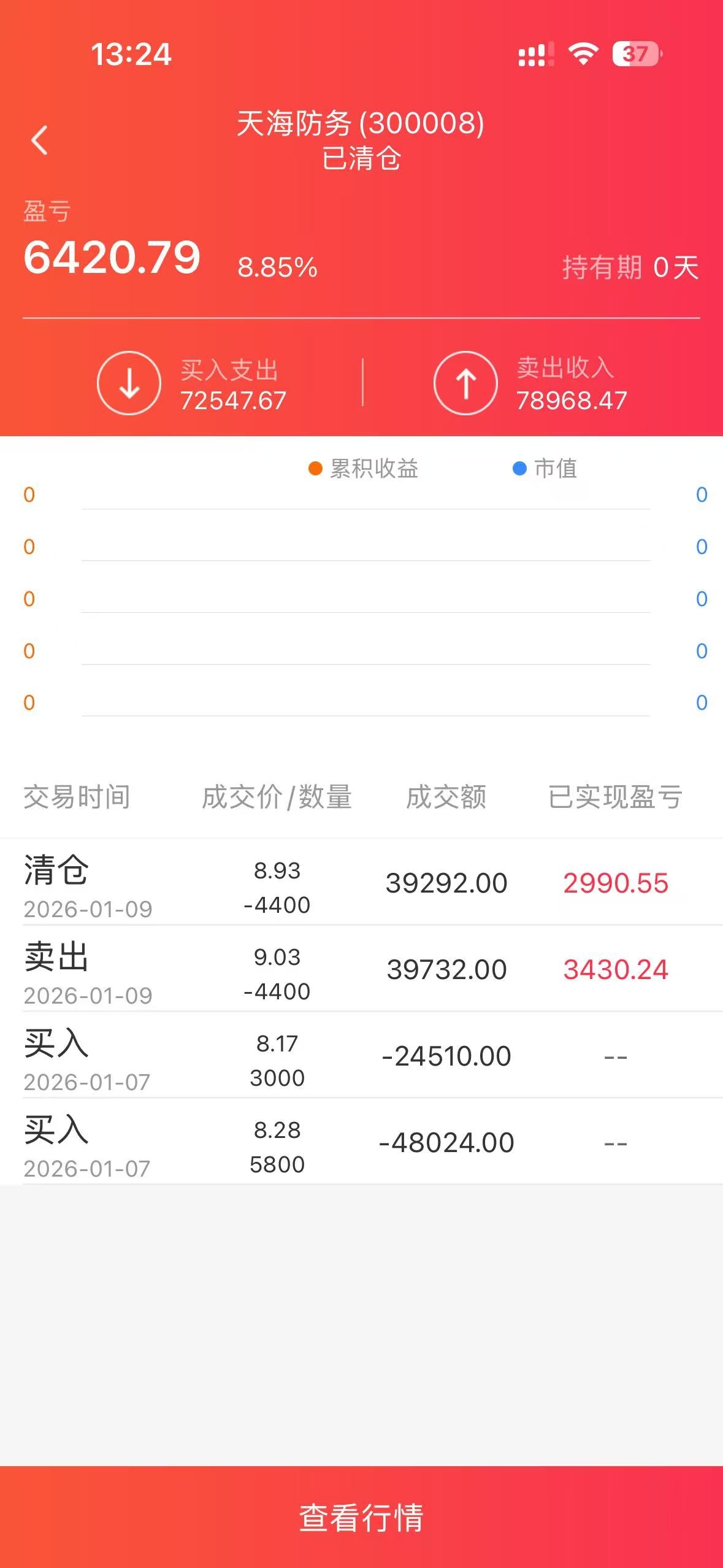 $天海防务(SZ300008)$ 持仓0天,获利8.8%,离场