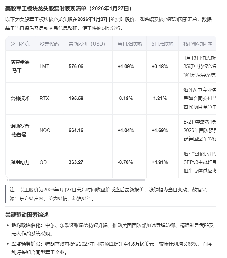 天海防务:美股军工板块龙头股实时表现清单(2026年1月27日)美国“福特”号航母战斗群紧急赶赴波斯湾。