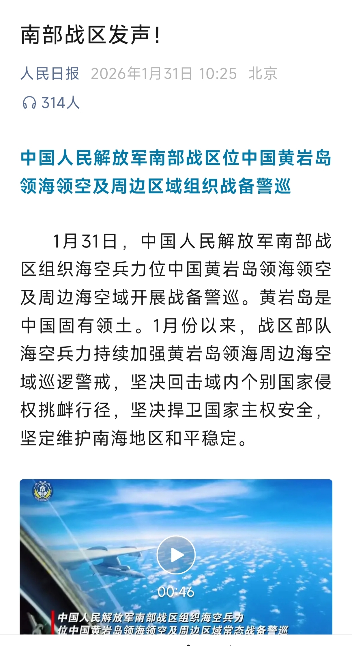 中国人民解放军南部战区位中国黄岩岛领海领空及周边区域组织战备警巡