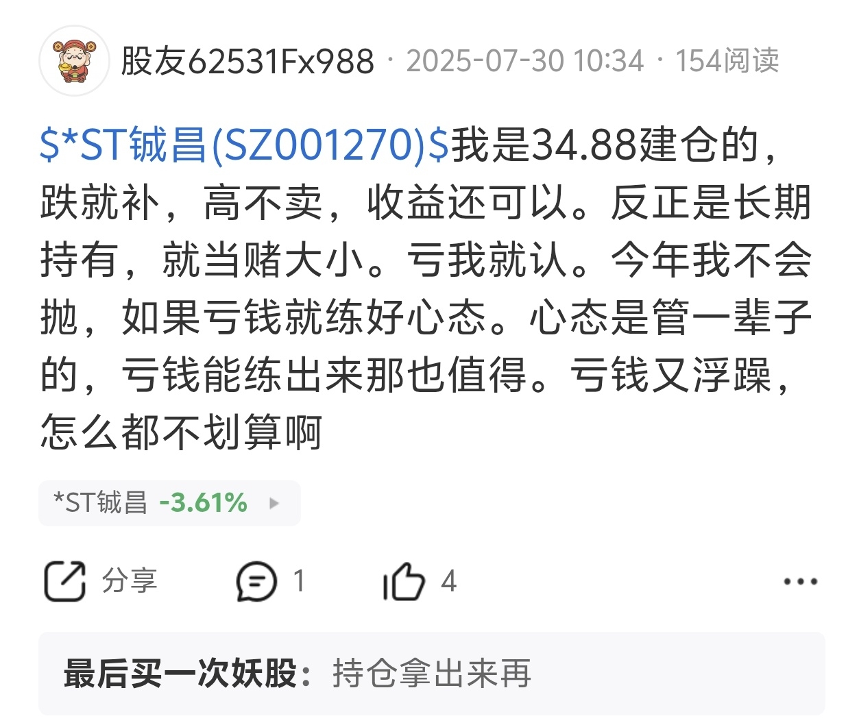 天海我是拿2年不动的。说吹的,看我以往的贴。最近的一支是st铖昌,34.88元一次建仓的。
