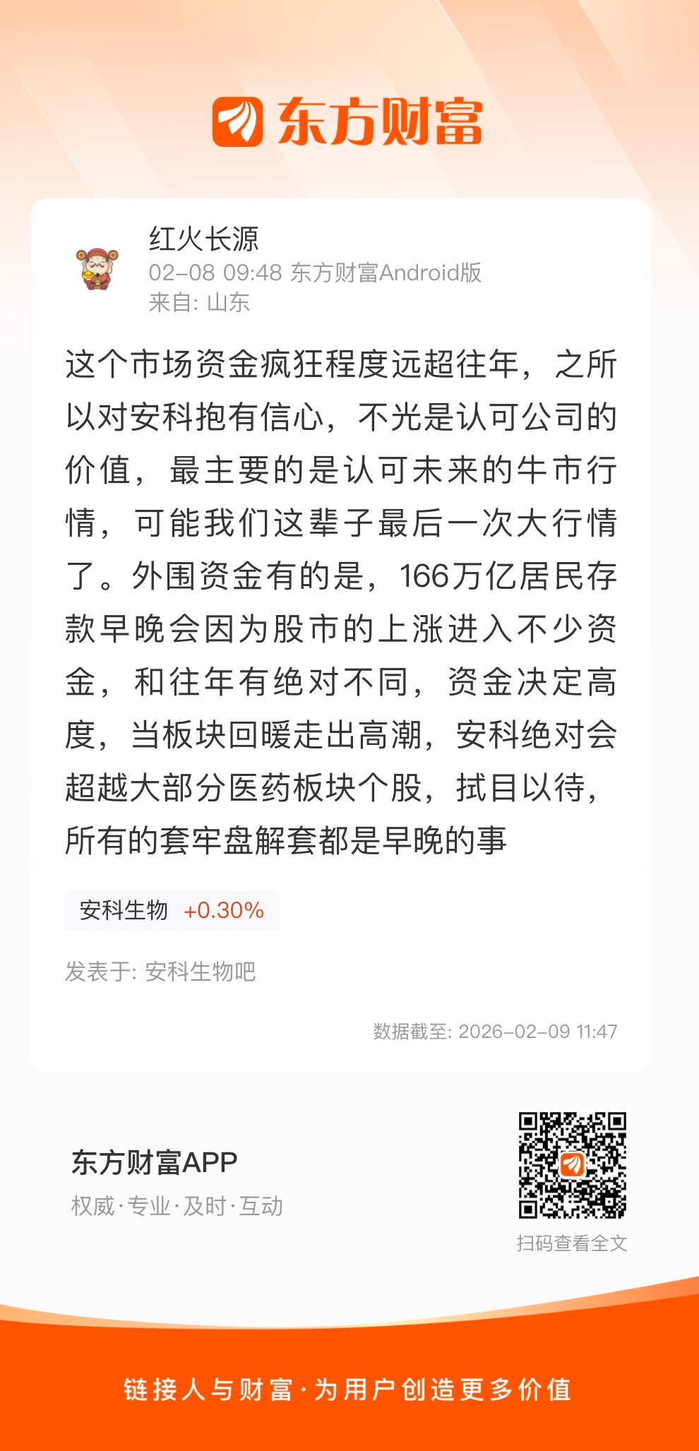 这个市场资金疯狂程度远超往年,之所以对安科抱有信心,不光是认可公司的价值,最主要的是认可未来的牛市行情,可能我们这辈子最后一次大行情了。外围资金有的是,166万亿居民存款早晚会因为股市的上涨进入不少资金,和往年有绝对不同,资金决定高度,当板块回暖走出高潮,安科绝对会超越大部分医药板块个股,拭目以待,所有的套牢盘解套都是早晚的事