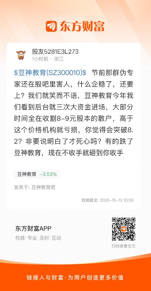 $豆神教育(SZ300010)$ 节前那群伪专家还在股吧里害人,什么企稳了,还要上?我们就笑而不语,豆神教育今年我们看到后台就三次大资金进场,大部分时间全在收割8-9元股本的散户,高于这个价格机构就亏损,你觉得会突破8.2?非要说明白了才死心吗?有的跌了豆神教育,现在不收手就砸到你收手