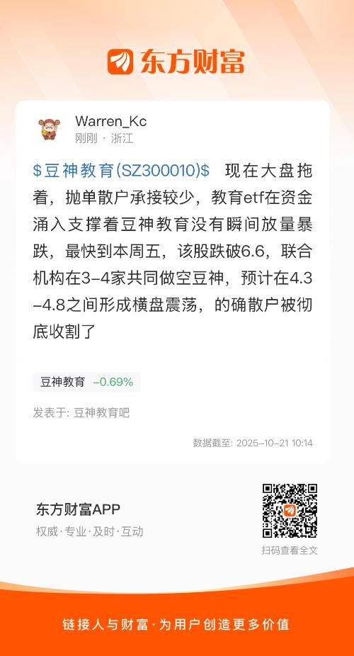 $豆神教育(SZ300010)$ 现在大盘拖着,抛单散户承接较少,教育etf在资金涌入支撑着豆神教育没有瞬间放量暴跌,最快到本周五,该股跌破6.6,联合机构在3-4家共同做空豆神,预计在4.3-4.8之间形成横盘震荡,的确散户被彻底收割了