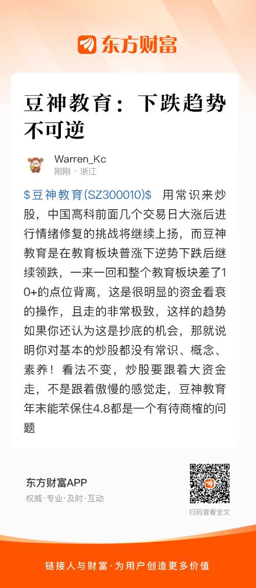 $豆神教育(SZ300010)$ 用常识来炒股,中国高科前面几个交易日大涨后进行情绪修复的挑战将继续上扬,而豆神教育是在教育板块普涨下逆势下跌后继续领跌,一来一回和整个教育板块差了10+的点位背离,这是很明显的资金看衰的操作,且走的非常极致,这样的趋势如果你还认为这是抄底的机会,那就说明你对基本的炒股都没有常识、概念、素养!看法不变,炒股要跟着大资金走,不是跟着傲慢的感觉走,豆神教育年末能芣保住4.8都是一个有待商榷的问题