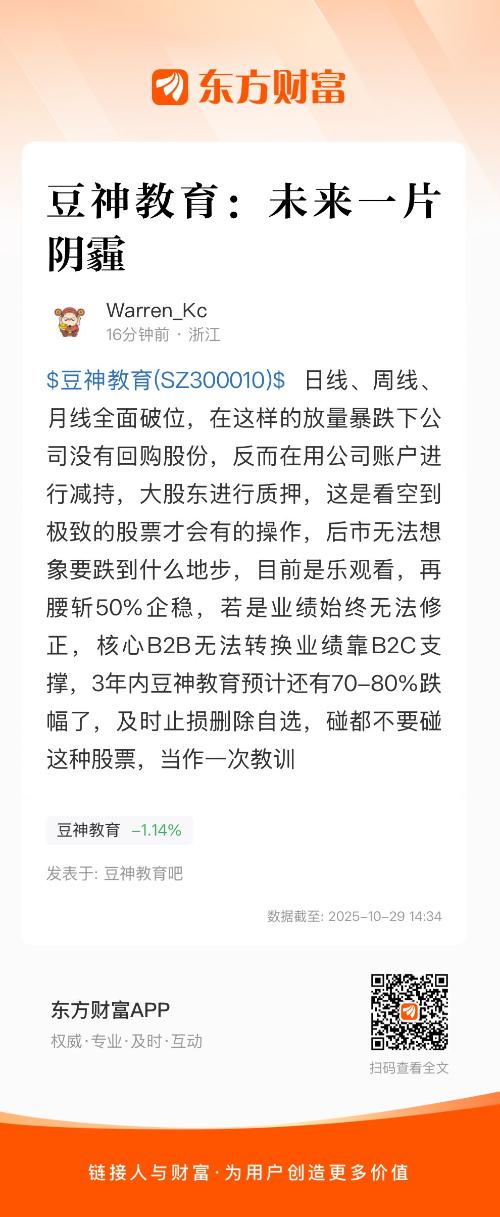 $豆神教育(SZ300010)$ 日线、周线、月线全面破位,在这样的放量暴跌下公司没有回购股份,反而在用公司账户进行减持,大股东进行质押,这是看空到极致的股票才会有的操作,后市无法想象要跌到什么地步,目前是乐观看,再腰斩50%企稳,若是业绩始终无法修正,核心B2B无法转换业绩靠B2C支撑,3年内豆神教育预计还有70-80%跌幅了,及时止损删除自选,碰都不要碰这种股票,当作一次教训