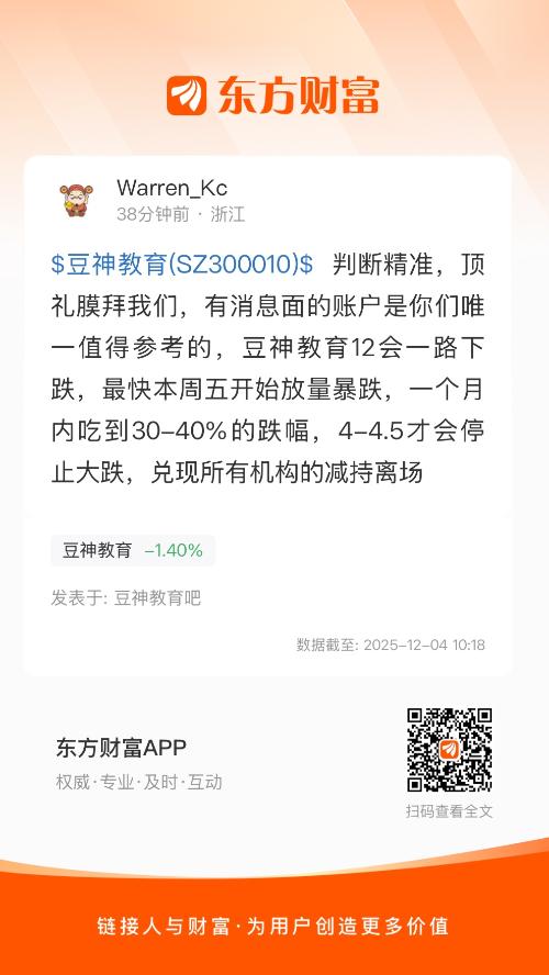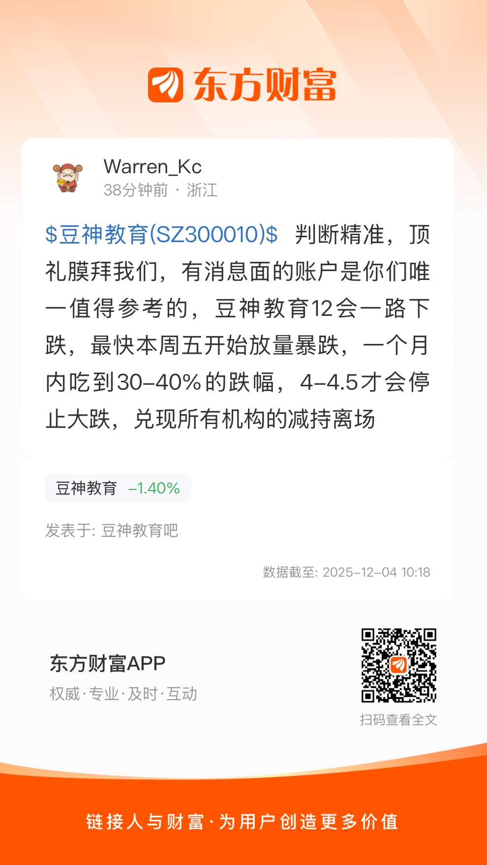 $豆神教育(SZ300010)$ 判断精准,顶礼膜拜我们,有消息面的账户是你们唯一值得参考的,豆神教育12会一路下跌,最快本周五开始放量暴跌,一个月内吃到30-40%的跌幅,4-4.5才会停止大跌,兑现所有机构的减持离场