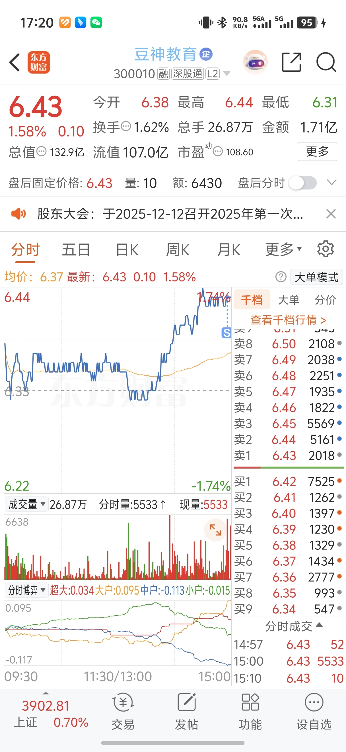 $豆神教育(SZ300010)$ 今天出,下周跌了再接回来