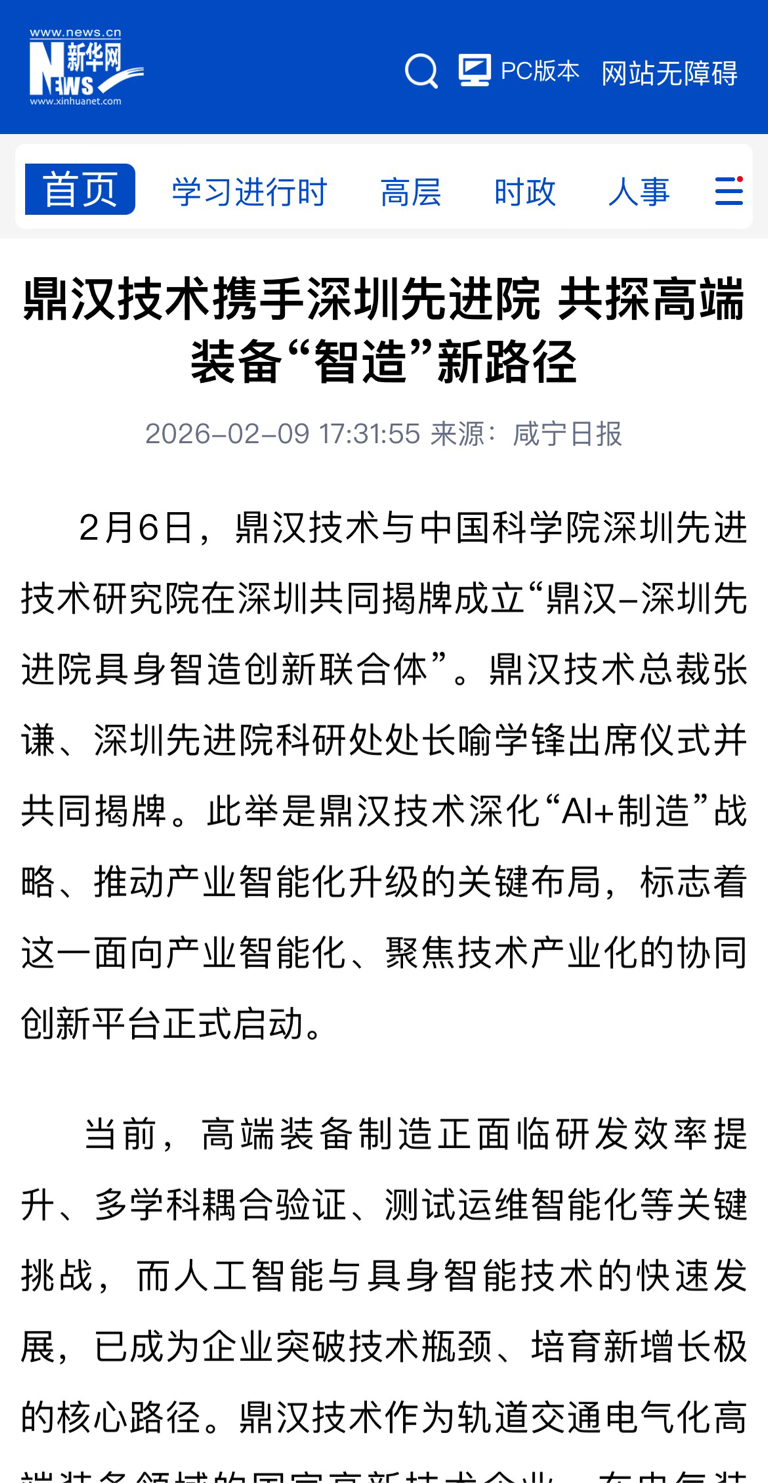 新华社报道:鼎汉技术携手深圳先进院共探高端装备“智造”新路径