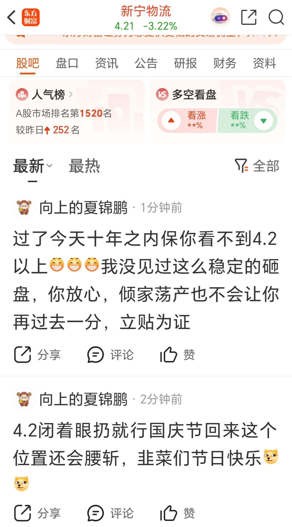$新宁物流(SZ300013)$ 新宁股吧无月㐫唱空的奇多。这个是本小散9.25截图的两贴。