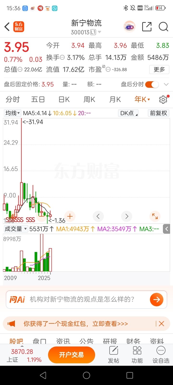 新宁物流负债大幅下降。已趋于平稳。历史最高点与现在相差幅度将近90%。差额巨大。有望提速回归合理价位。股东集中。已达到控盘。