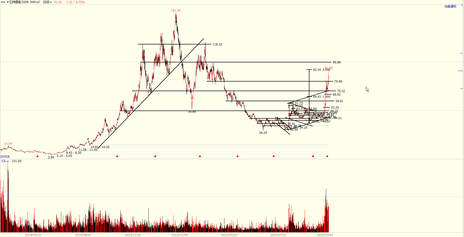 一把直尺打天/亿纬锂能30-50之间大规模头肩底,对应第一趋势目标100;现阶段