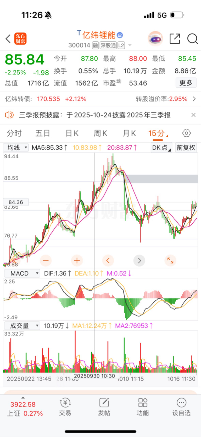 $亿纬锂能(SZ300014)$ 来点成交量过85,就能看到90,大跌11%那天单抽,以及第二天就是85就下来了。放假突破可以做个4-5块差价