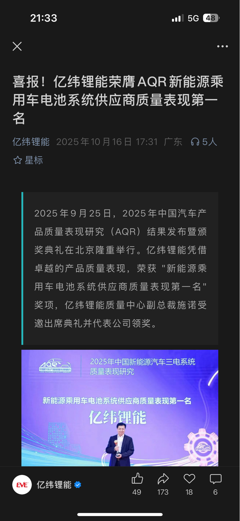 亿纬锂能居然获得乘用车电池系统质量第一名,我就说亿纬锂能技术上没输过,但是销量上