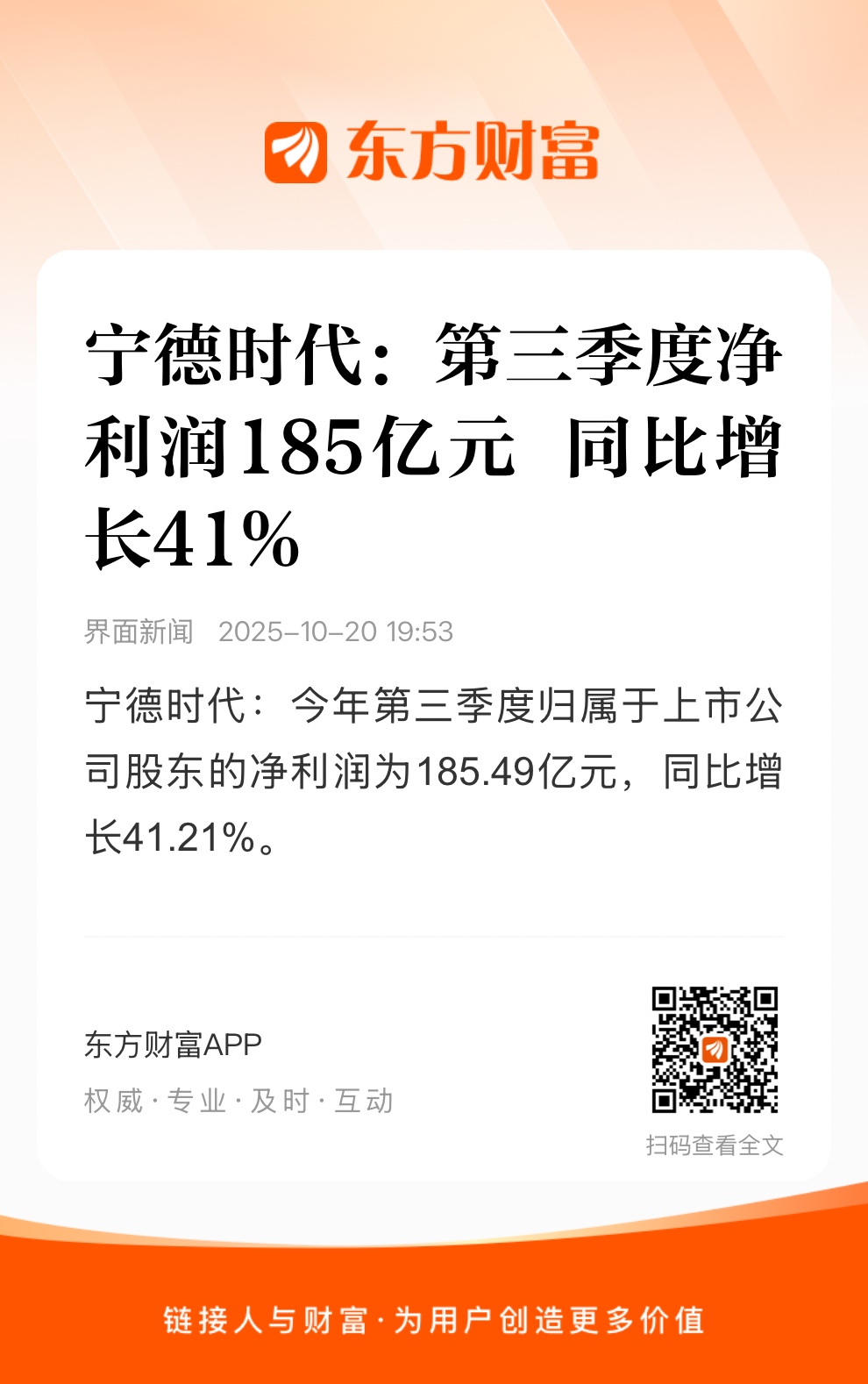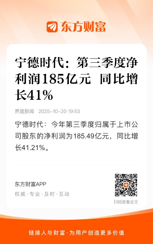 10月20日晚间,宁德时代在港交所公告,2025年第三季度归母净利润185.5亿元,同比增长41.21%;前三季度归母净利润490.3亿元,同比增长36.20%。