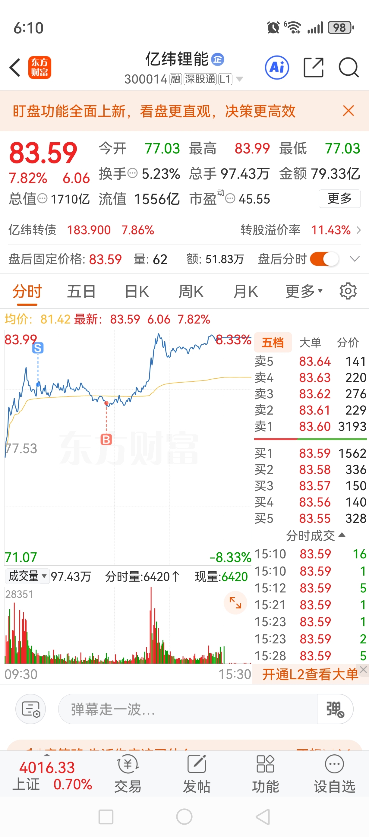 $亿纬锂能(SZ300014)$ 今天做T风险好大如果没有及时上车,那就亏大了。下午去打麻将3:00打开一看吓我一跳。